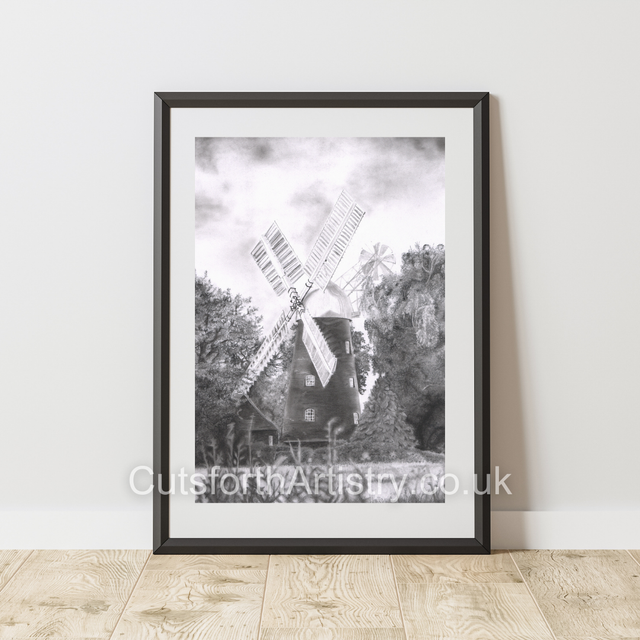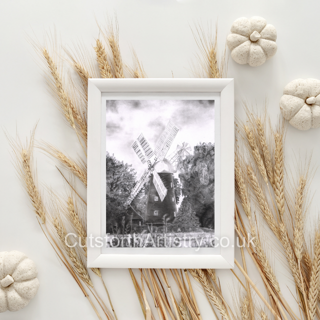 Capturing the quiet strength and rustic charm of this historic Lincolnshire landmark. The soft gradients of charcoal bring depth to the brick tower, sails, and surrounding foliage, evoking a sense of calm and timelessness. Each fine art giclée print is produced using archival inks on premium textured paper, faithfully preserving every subtle mark and tonal shift from the original drawing. This piece celebrates the enduring beauty of rural craftsmanship and the heritage of Lincolnshire’s countryside. Perfect for collectors of traditional art, local history enthusiasts, or anyone drawn to the serenity of hand-rendered charcoal work. Created by Cutsforth Artistry – Charcoal Artwork With Soul, Crafted In Fine Detail.