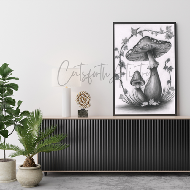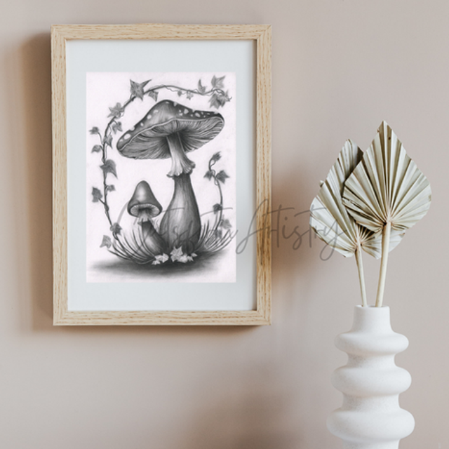 — two mushrooms intertwined beneath a gentle weave of ivy. The soft charcoal tones and delicate shading evoke warmth, connection, and the nurturing spirit of nature’s hidden world.